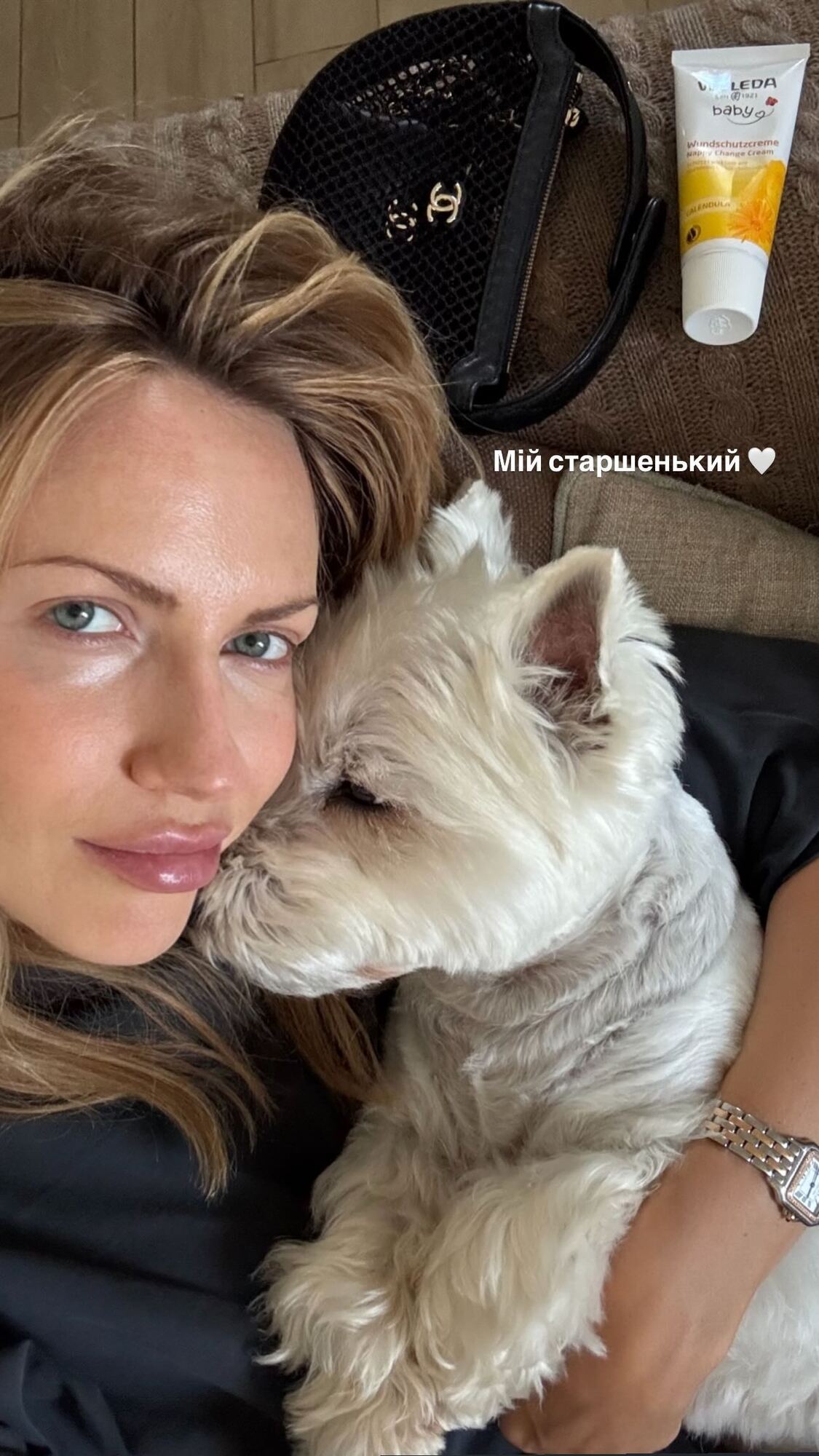 Телеведущая снялась со своим песиком Рафаэлем (Рафиком) на руках.