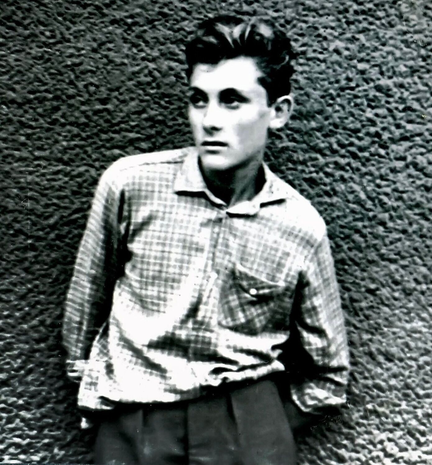 На черно-белом снимке Мозговой запечатлен у стены, опершись на нее. Он одет в клетчатую рубашку и брюки.