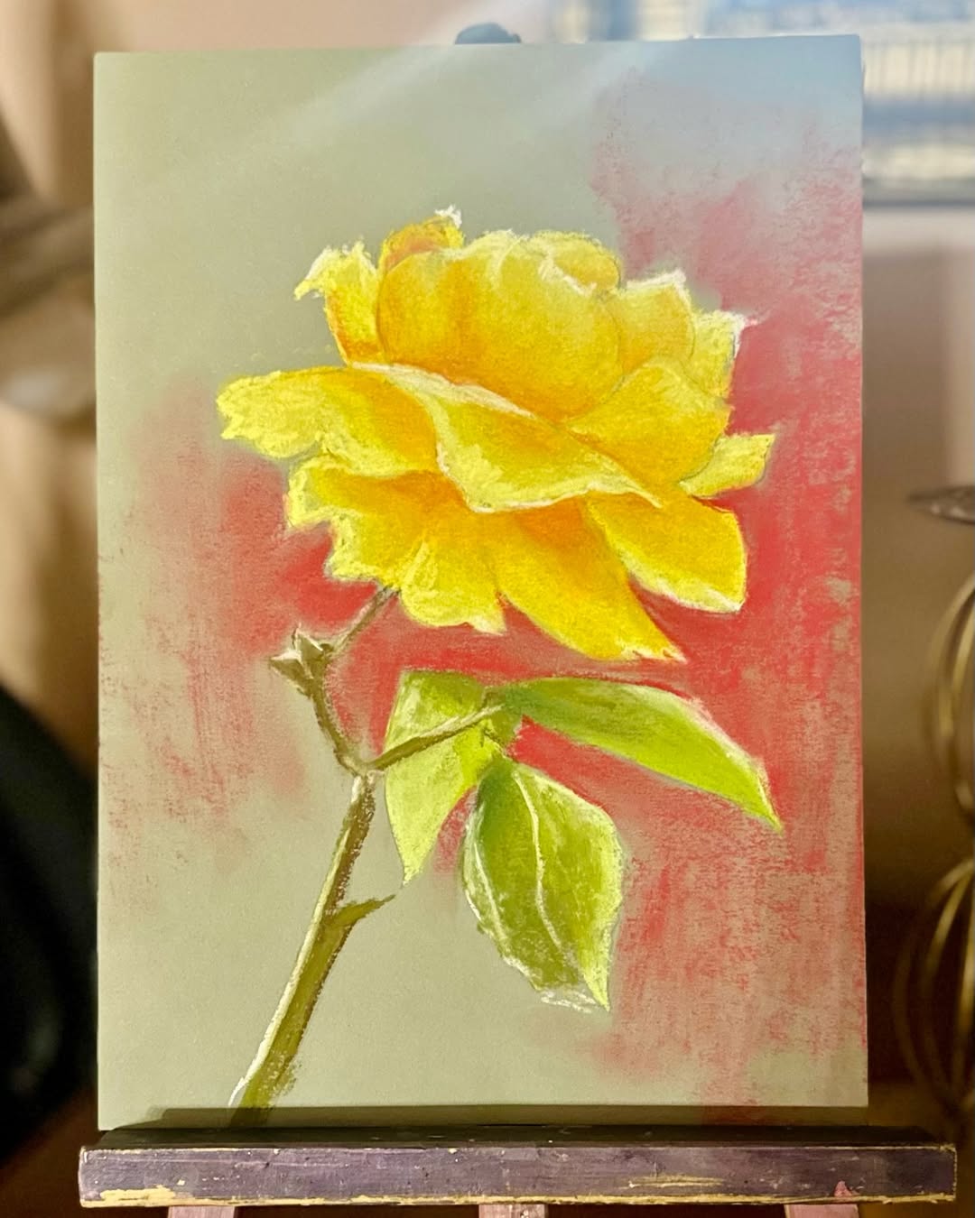 Соломия нарисовала распустившуюся желтую розу на розовом фоне.