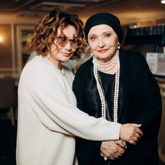 На фото, опубликованном Аленой Мозговой, она обнимает маму. Виолетта Мозговая позировала в черной одежде и в украшениях из большого количества жемчуга.