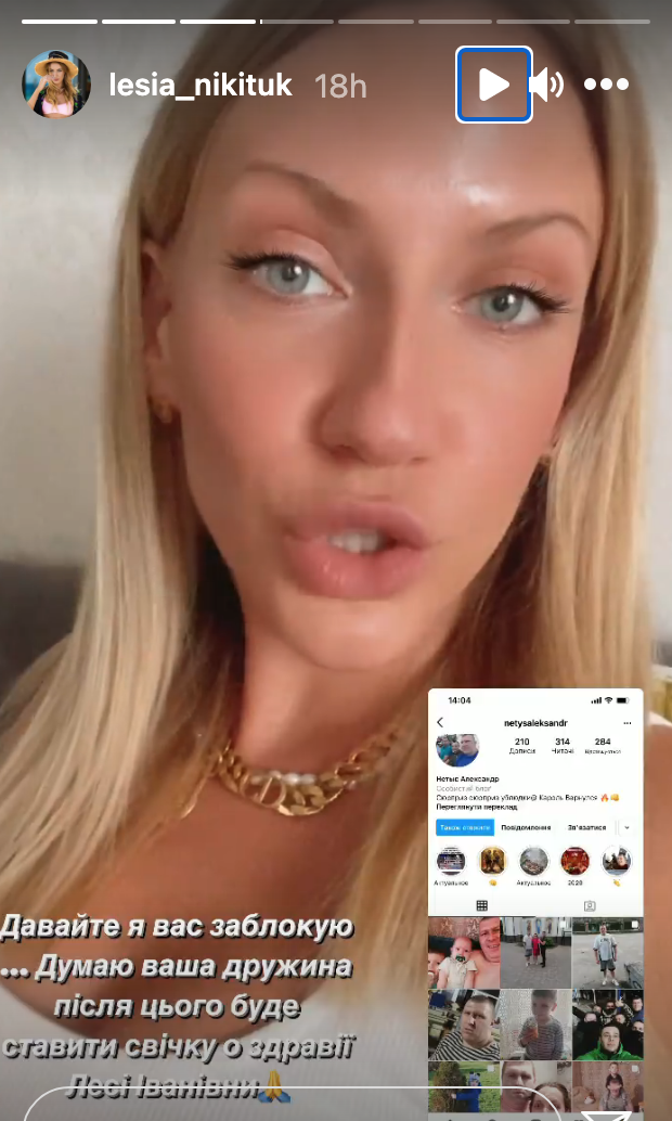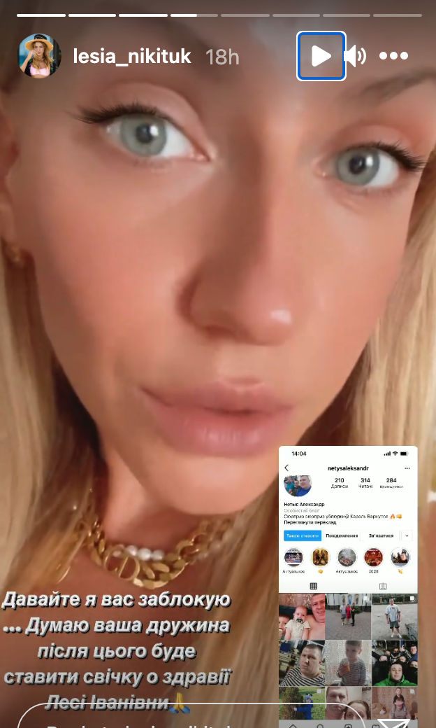 Кроме того, она пообещала заблокировать этого пользователя. "Думаю, ваша жена после этого будет ставить свечку во здравие Леси Никитюк", – подчеркнула телеведущая.