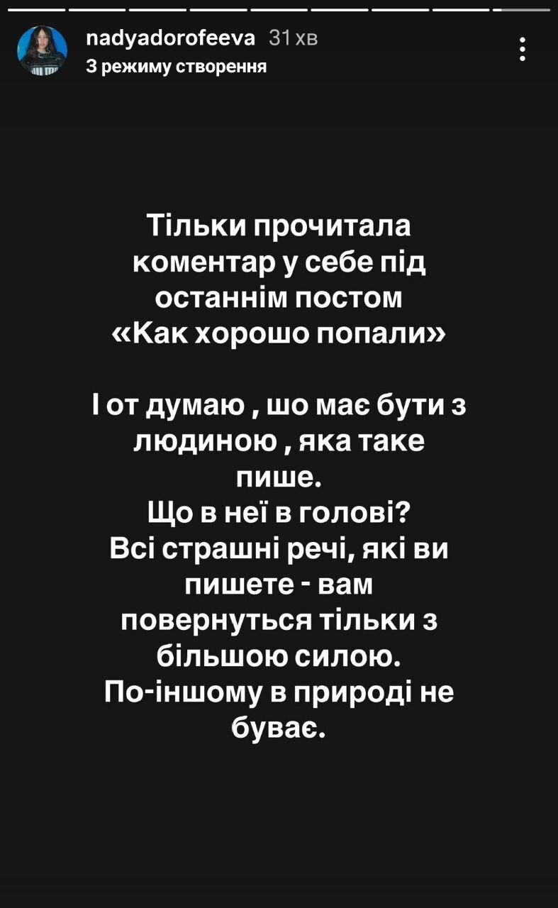Украинская певица Надя Дорофеева 17 июня в Instagram Stories возмутилась комментарием пользователя под ее сообщением о масштабной атаке на Киев страной-агрессором Россией.