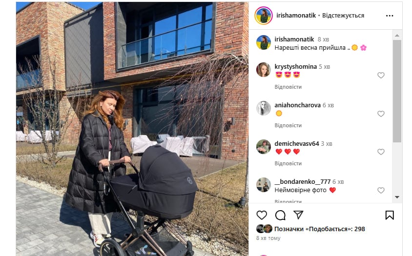 Жена украинского артиста Monatik (Дмитрия Монатика), Ирина Монатик 6 марта разместила в Instagram фото, на котором запечатлена во время прогулки с третьим сыном, который находился в коляске.
