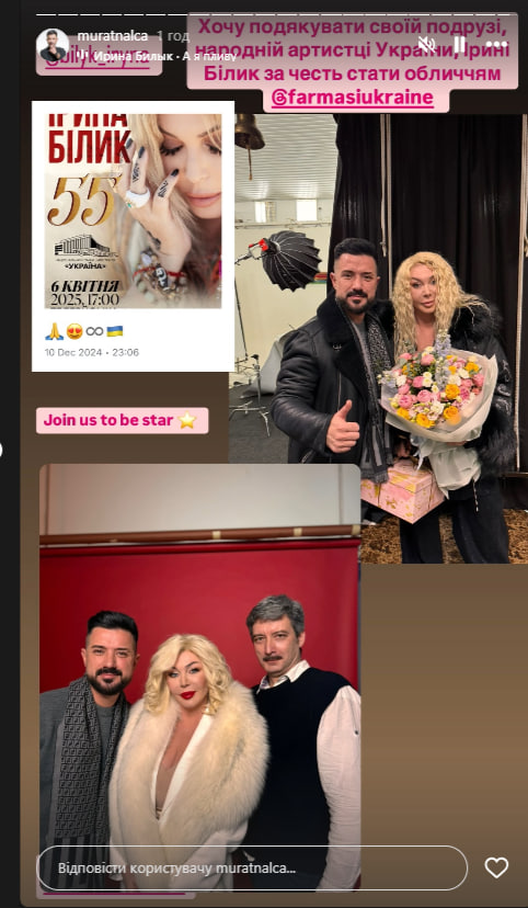 Украинский бизнесмен турецкого происхождения Мурат Налчаджиоглу 10 января в Instagram Stories разместил коллаж из фото, на которых запечатлен в компании украинской певицы Ирины Билык.