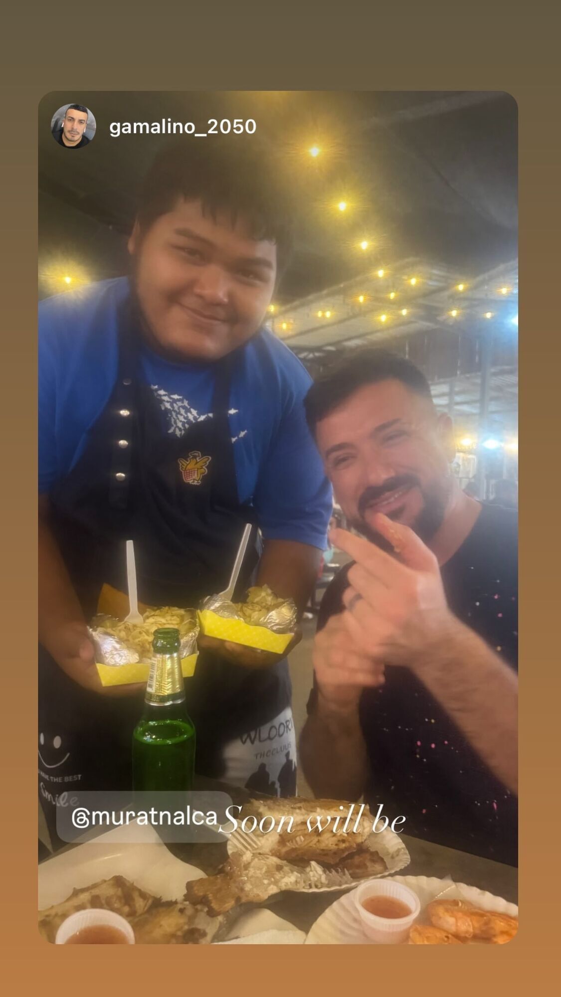 Налчаджиоглу, улыбаясь, снялся за столом уличного бара. Перед ним на столе можно заметить тарелки с едой и бутылку пива.