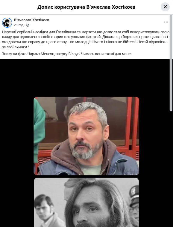 "Насильник и мразь. Они похожи". Вячеслав Хостикоев сравнил Билоуса с известным серийным убийцей Мэнсоном