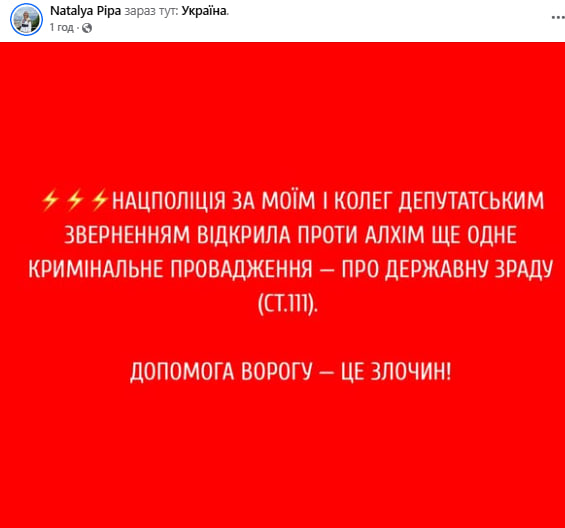 "Нацполиция по моему и коллег депутатским обращениям открыла против Алхим еще одно уголовное производство – о государственной измене (ст. 111)", – написала она.