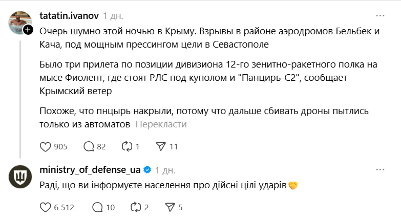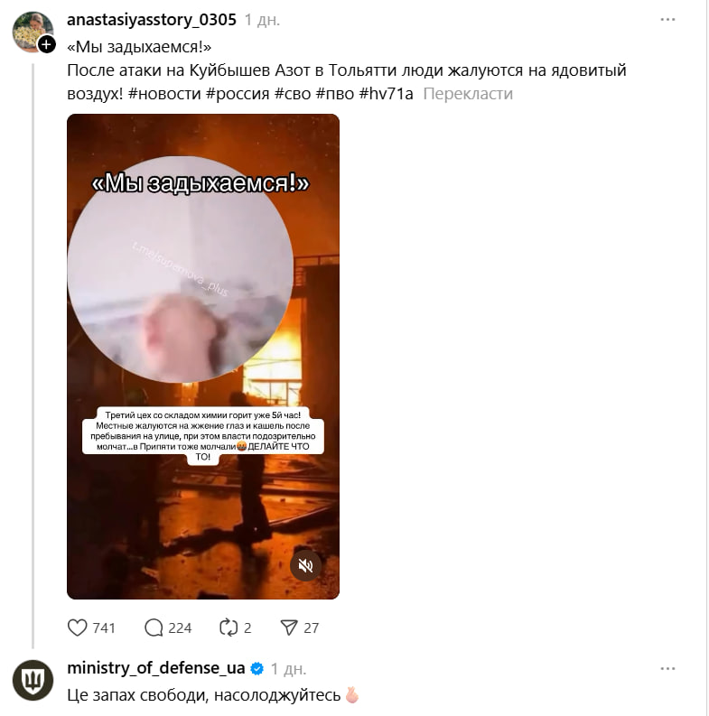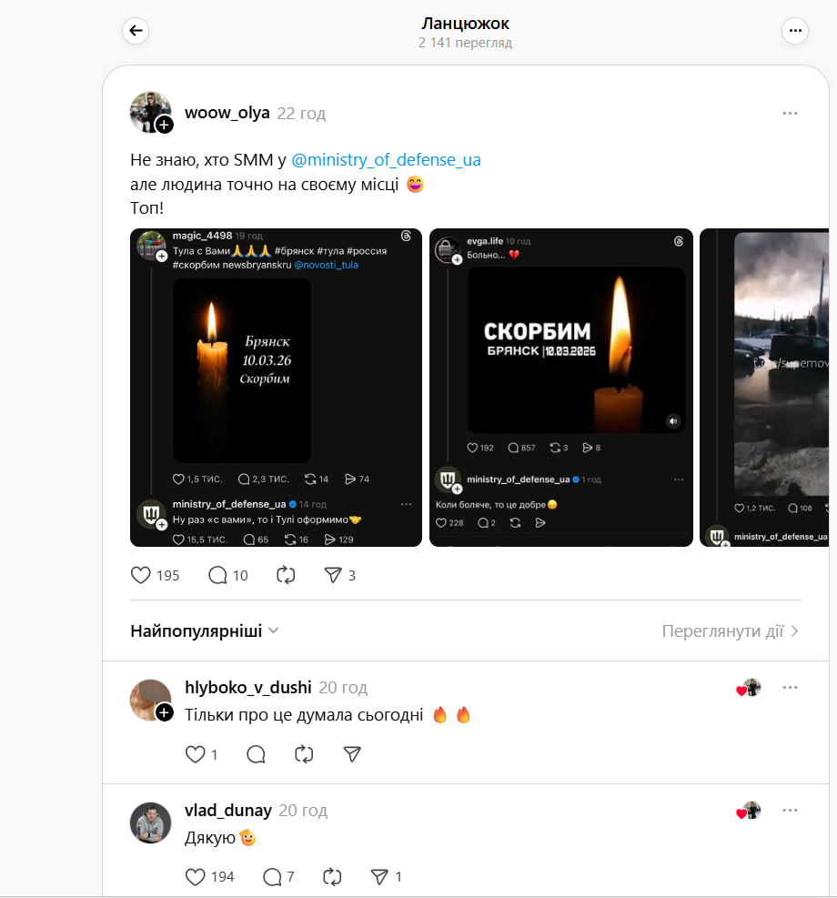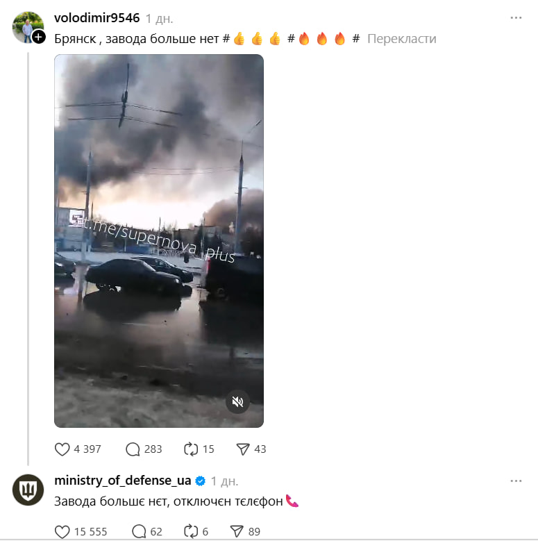 Сммщик официальной страницы Министерства обороны Украины стал сенсацией в украинском сегменте соцсети Threads – он активно троллит россиян, которые жалуются, что силы обороны Украины нанесли удар ракетами Storm Shadow по одному из ключевых предприятий российского военно-промышленного комплекса "Кремний Эл" в Брянске.