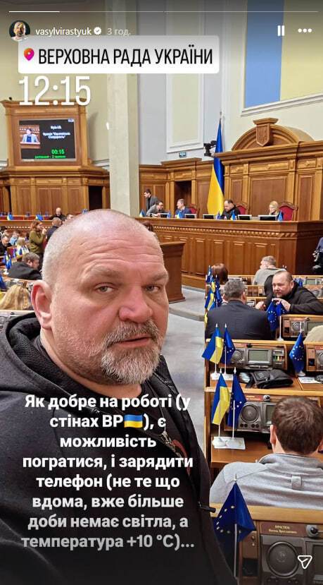 Нардеп от "Слуги народа", украинский стронгмен Василий Вирастюк 13 января в Instagram Stories заявил, что в стенах Верховной Рады сейчас гораздо теплее, чем у него дома.