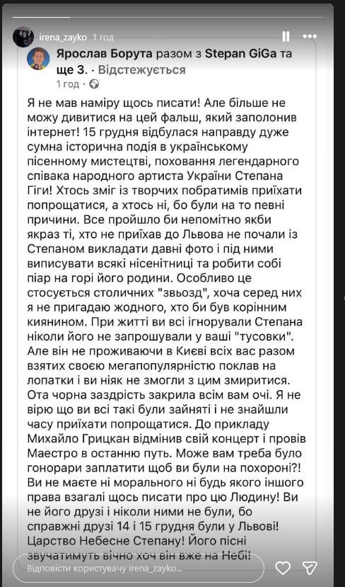"Больше не могу смотреть на фальш, которая заполнила интернет. 15 декабря прошло действительно очень печальное историческое событие в украинском песенном искусстве – похороны Степана Гиги! Кто-то смог из творческих побратимов приехать попрощаться, а кто-то – нет, потому что были на то определенные причины, – написал Борута. – Все прошло бы незаметно, если бы те, кто не приехал во Львов, не начали со Степаном выкладывать давние фото, и под ними выписывать всякую чепуху и делать себе пиар на горе его семьи".