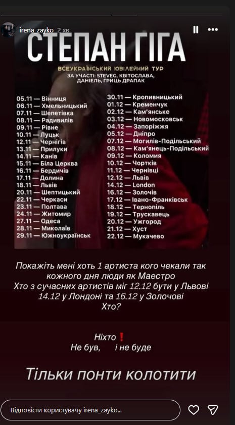 Мнение Боруты поддержала пресс-менеджер Степана Гиги Ирена Зайко, разместив скриншот публикации на своей странице в Instagram Stories.