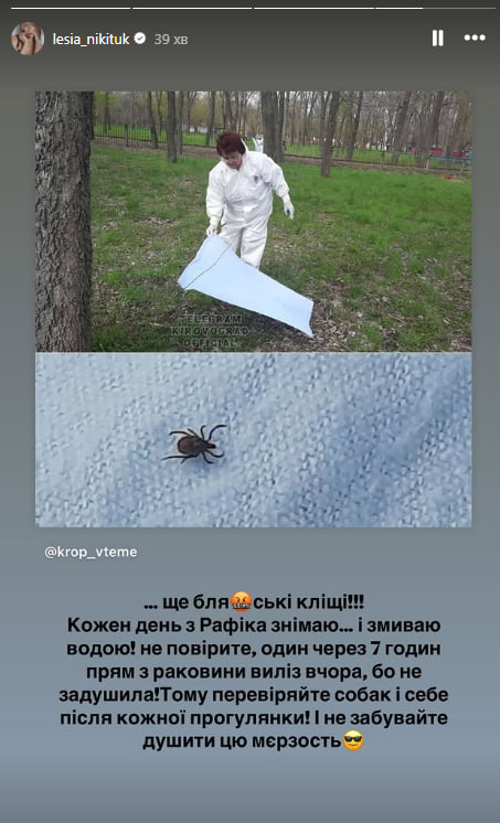 Украинская ведущая Леся Никитюк 22 апреля в Instagram Stories напомнила своим подписчикам о том, что начался так называемый сезон клещей, которые опасны как для людей, так и для животных.