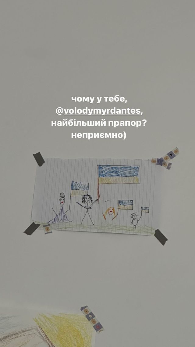 Украинский дизайнер Даша Кацурина в Instagram Stories 4 сентября разместила снимок детского рисунка, на котором ее дети изобразили себя, маму и возлюбленного Кацуриной, музыканта Владимира Дантеса (Dantes).