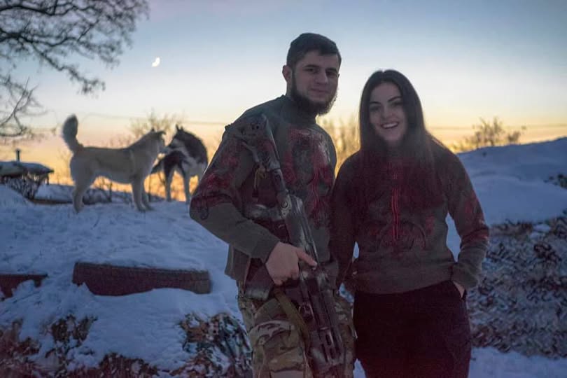 На фото Коцюбайло и Михайлова сфотографированы на фоне снега. Жених парамедика позирует в военной форме с оружием. В кадре также две собаки.