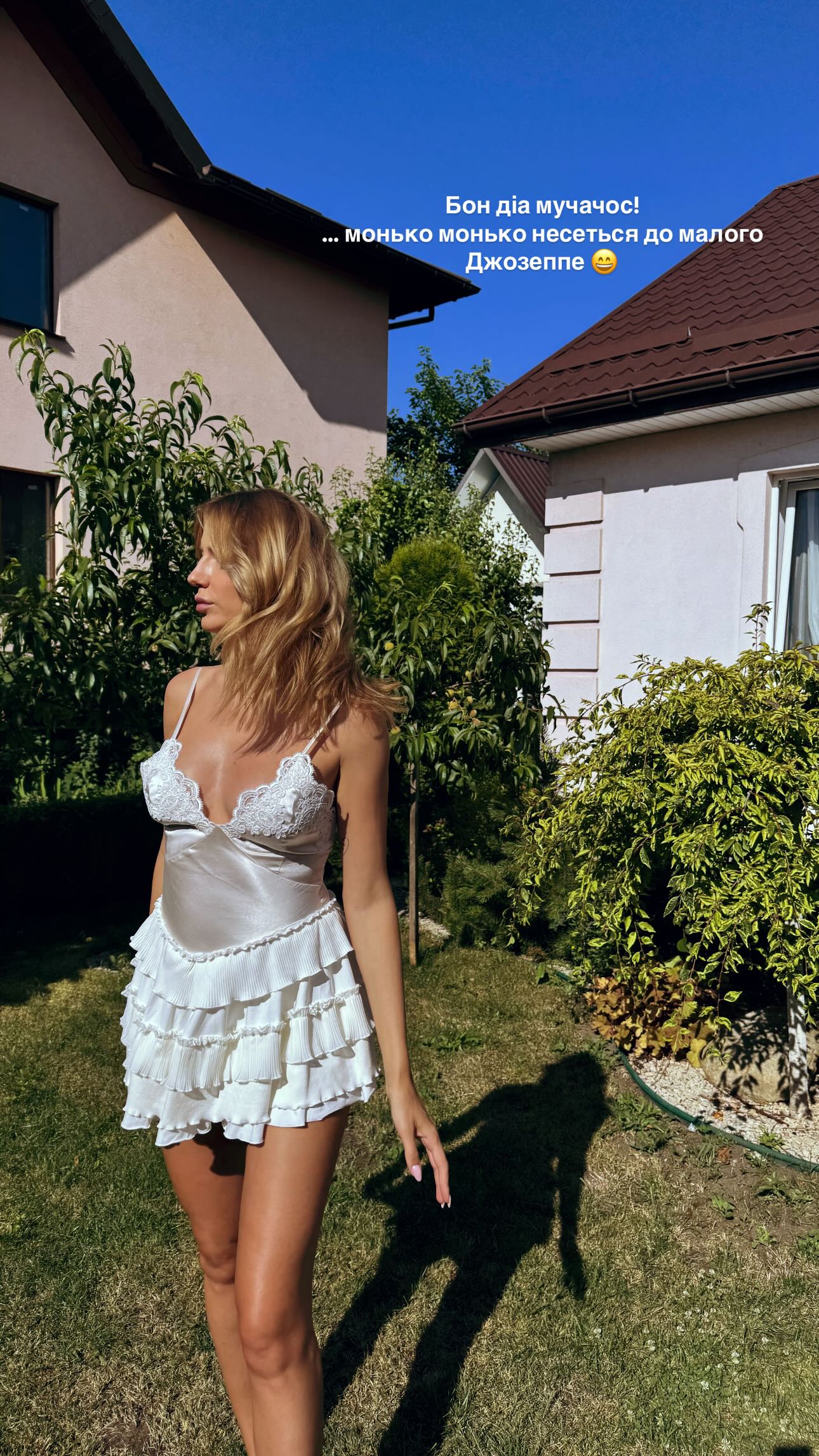 Украинская телеведущая Леся Никитюк, родившая первенца, в Instagram Stories 8 июля показала свое фото, сделанное во дворе дома.