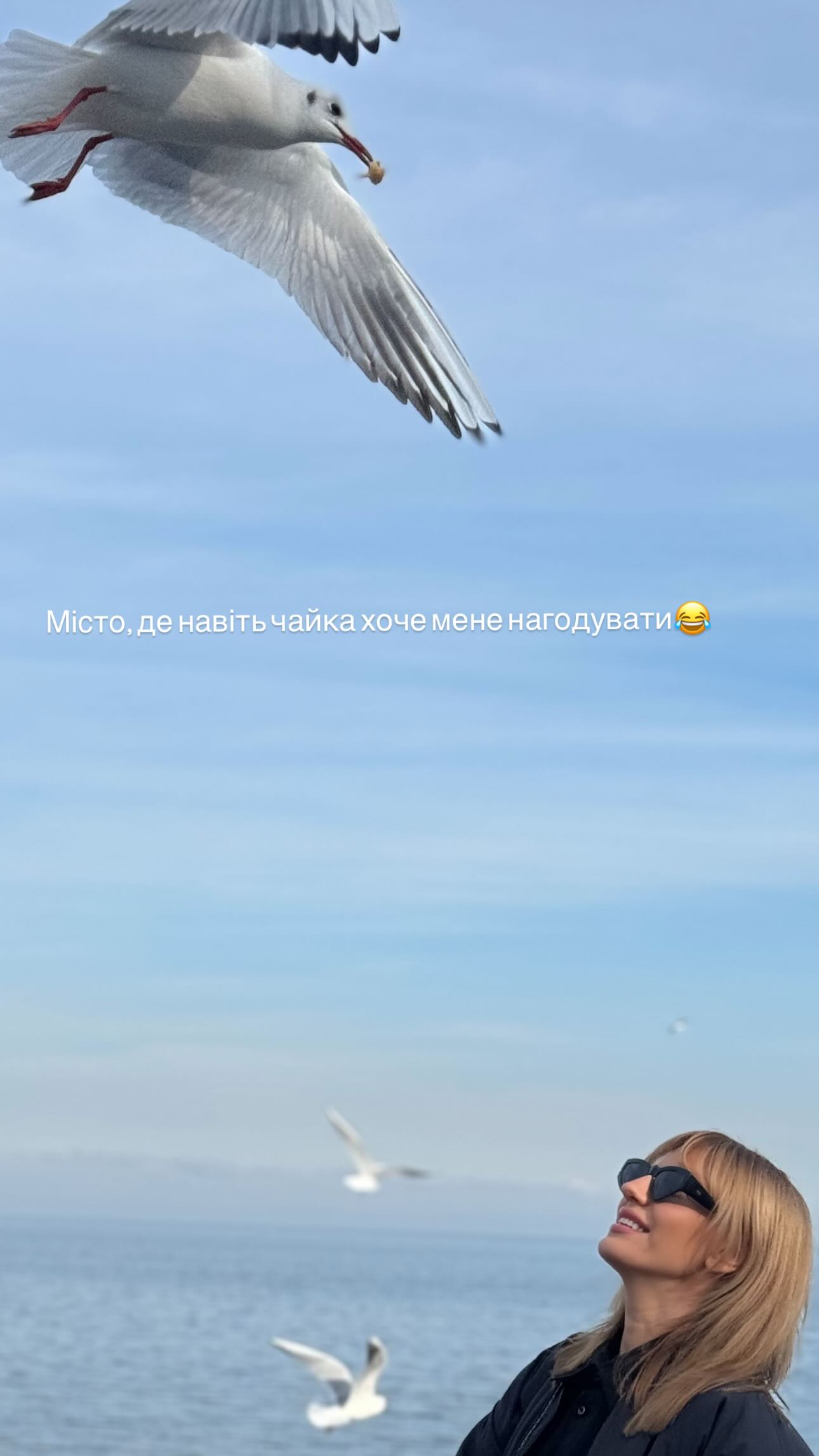 "Город, где даже чайка хочет меня накормить", – отметила Никитюк в подписи к еще одному фото. На нем можно увидеть чайку, держащую в клюве добычу. Телеведущая наблюдает за птицей.