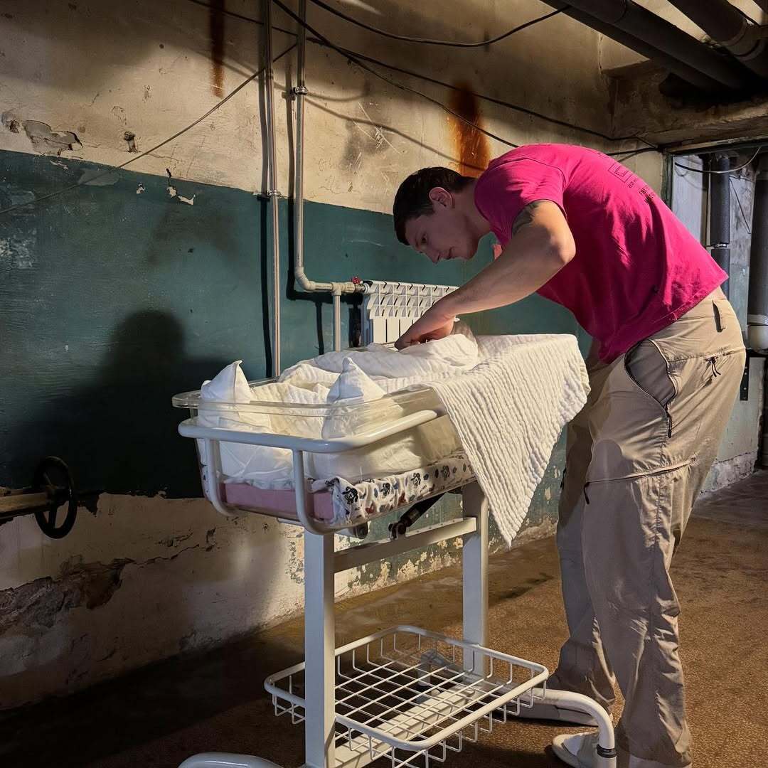 Ведущая показала фото, на котором ее муж, украинский военнослужащий Дмитрий Бабчук стоит в укрытии возле кроватки с новорожденным сыном.