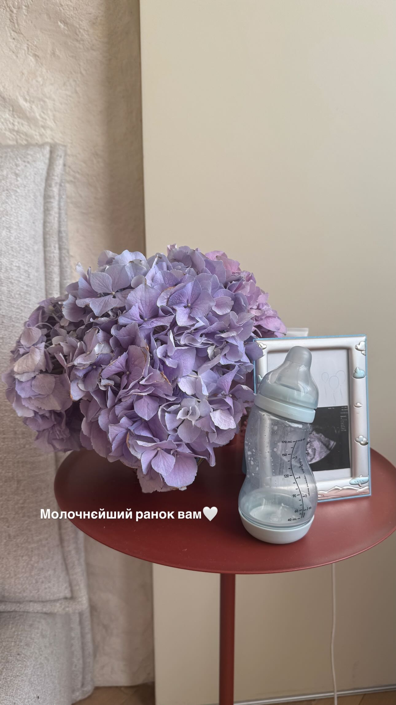 Никитюк показала на столике гортензию в вазе, рядом фото с УЗИ, на котором изображен ее ребенок еще до рождения, а также стеклянную бутылку для молока