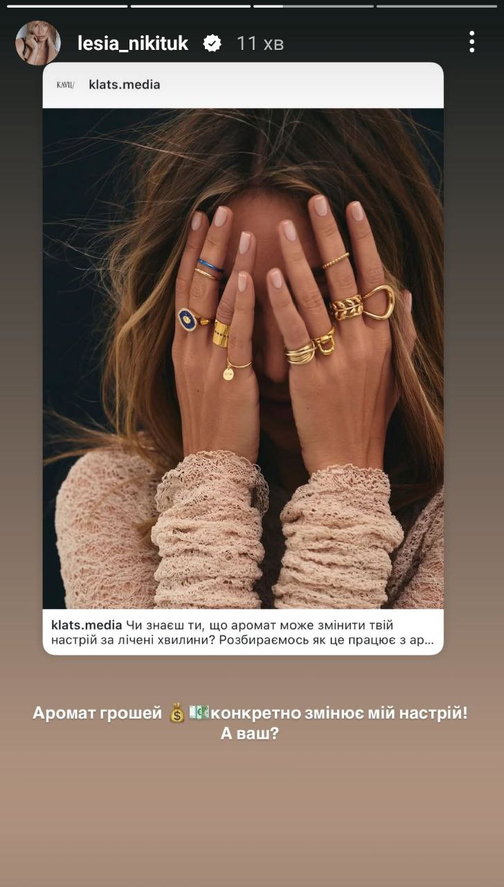 Украинская ведущая Леся Никитюк 6 июля в Instagram Stories распространила сообщение, в котором обсуждается влияние ароматов на настроение человека.
