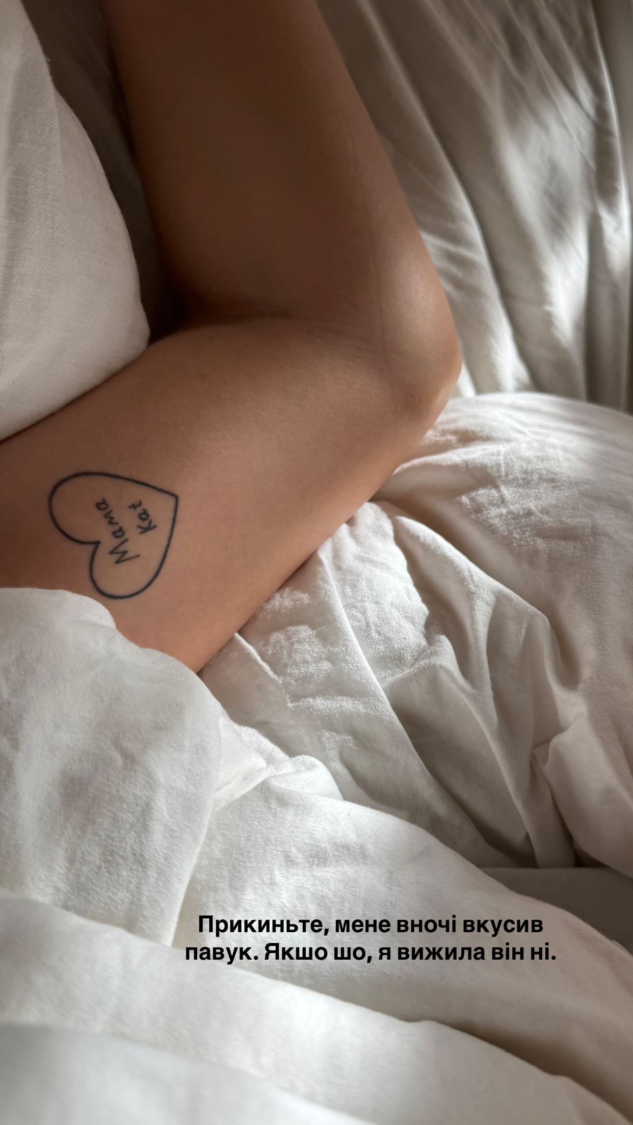 Телеведущая снялась в постели. Она показала свое бедро с татуировкой в виде сердца и надписью внутри: "Мама Kat".