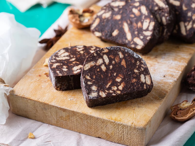 Никишина после приготовления шоколадной колбасы отметила, что в ней достаточно много печенья, но по рецепту этот десерт таким и должен быть.