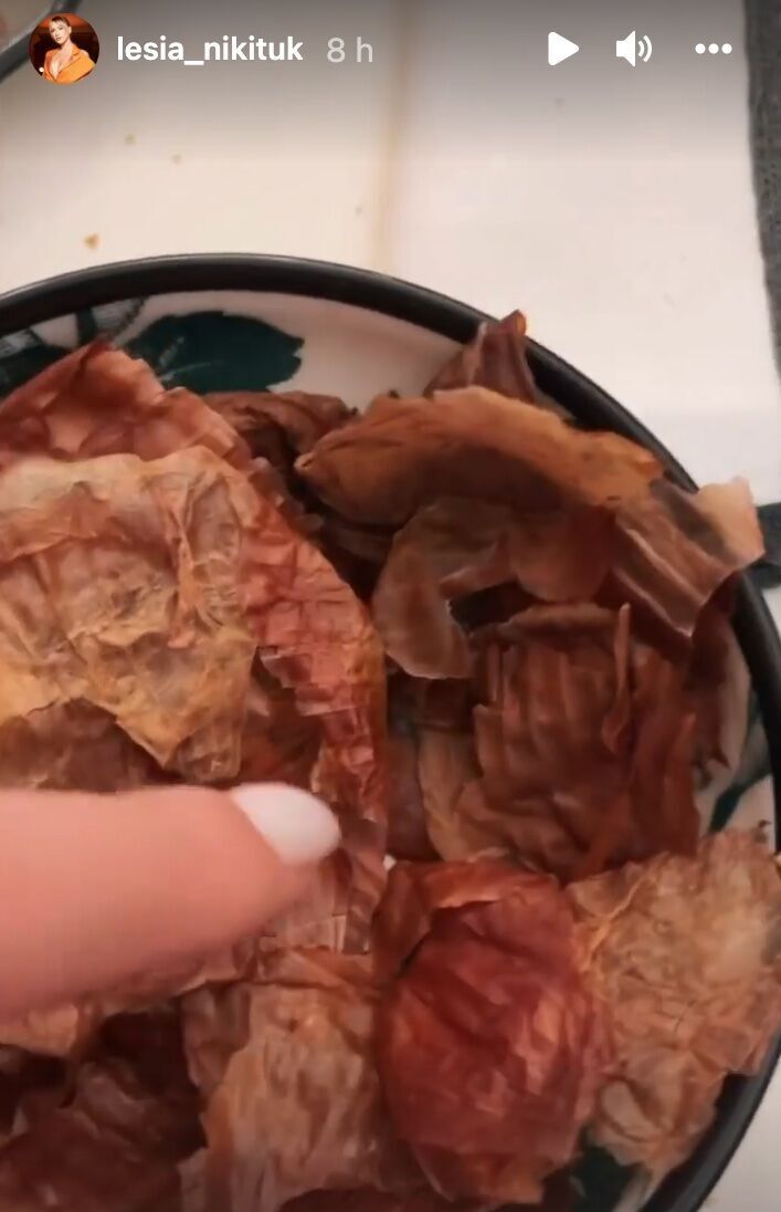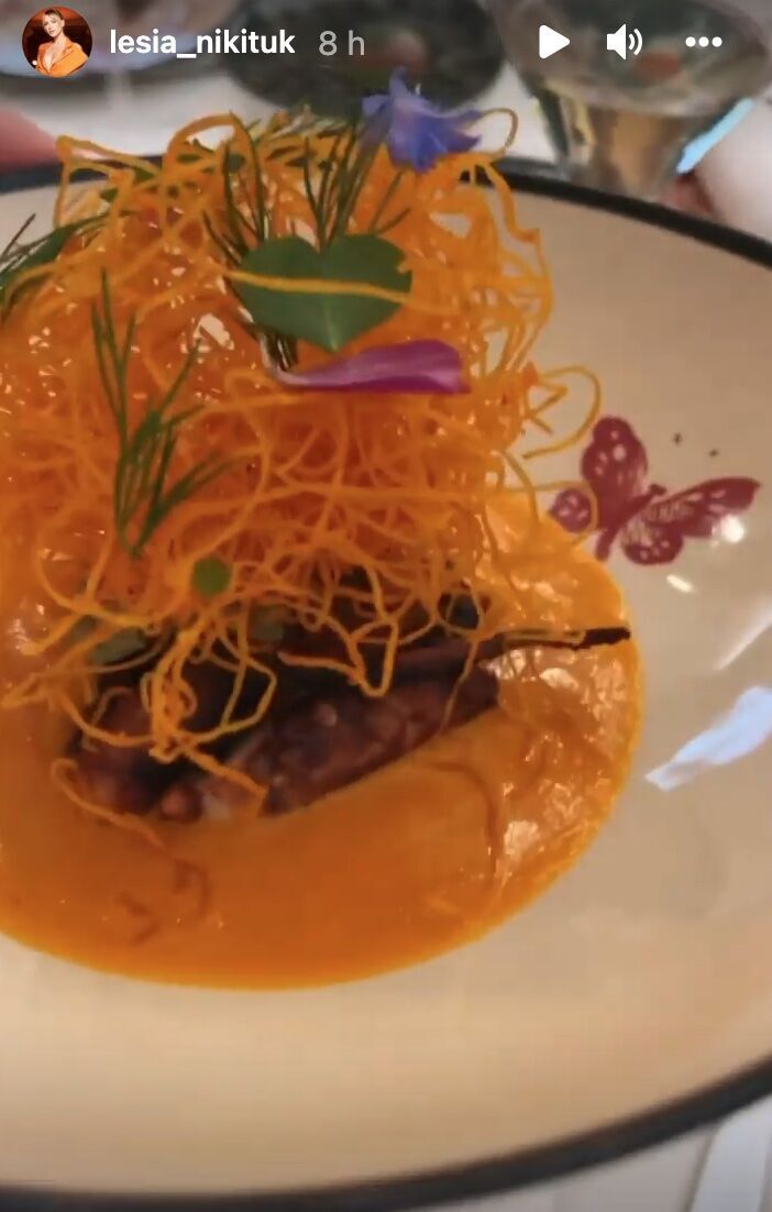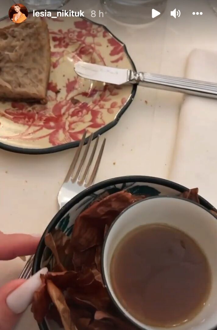 В роликах Никитюк крупным планом показывает свой заказ, в том числе луковый суп за €50 (около 1,5 тыс. грн). Суп объемом около 100 мл принесли в небольшой пиалушке и на блюдце с луковой шелухой.