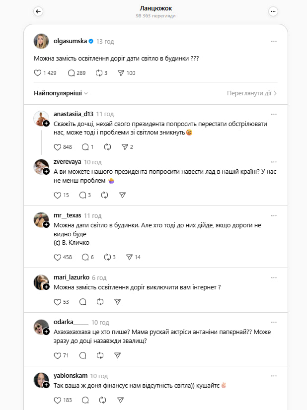Ольга Сумская возмутилась отключениями света. Ей напомнили о дочери в РФ и предложили большую панамку фото 1 Скриншот: olgasumska / Threads