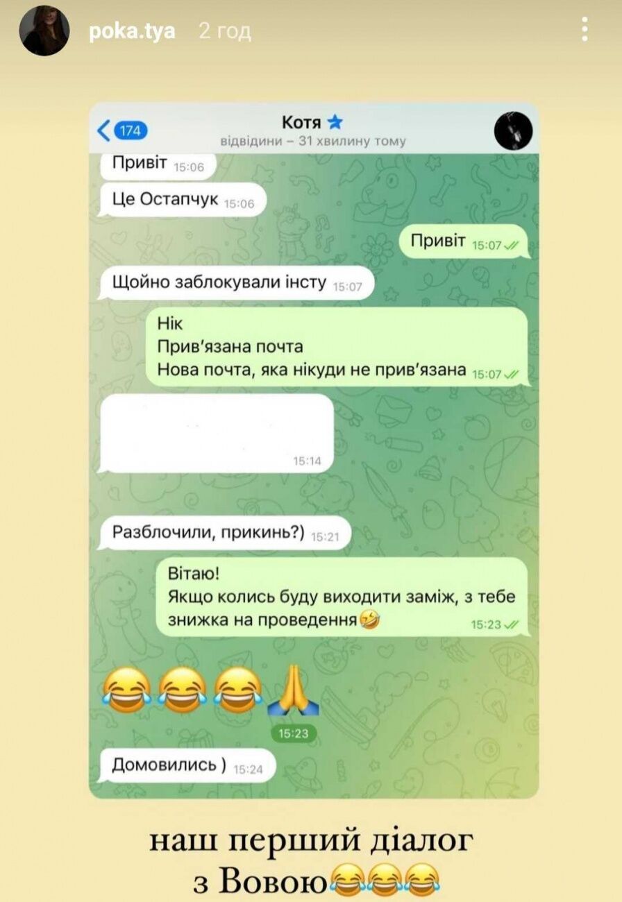 23-летняя избранница 38-летнего украинского ведущего Владимира Остапчука, блогер Катерина Полтавская 24 июля в Instagram Stories разместила скриншот их первой переписки.