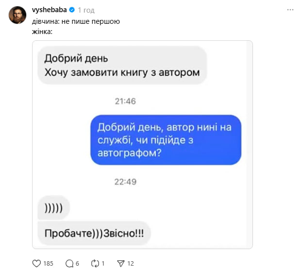 Украинский писатель, поэт и военнослужащий Павел Вышебаба 21 ноября в соцсети Threads разместил скриншот сообщения от поклонницы, которая, обращаясь к нему, допустила забавную опечатку, кардинально изменившую смысл предложения.
