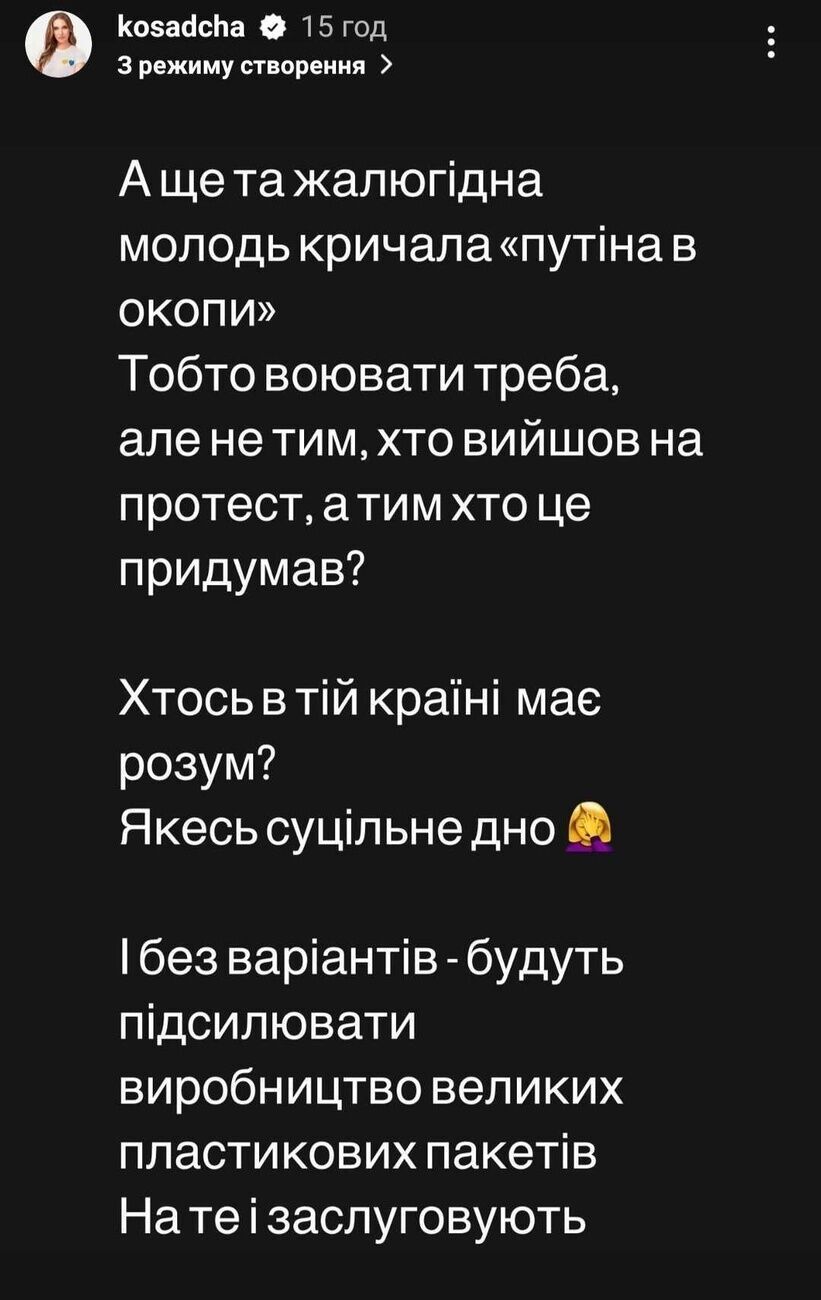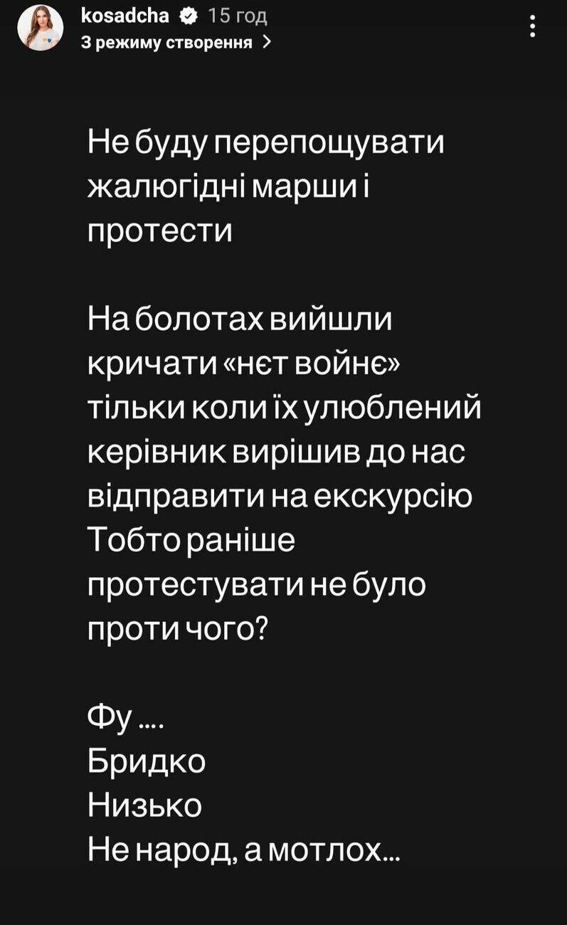 "Не буду репостить жалкие марши и протесты. На болотах вышли кричать "нет войне", только когда любимый руководитель решил их к нам отправить на экскурсию, – написала Осадчая. – То есть раньше протестовать не было против чего? Фу! Мерзко, низко, не народ, а хлам".
