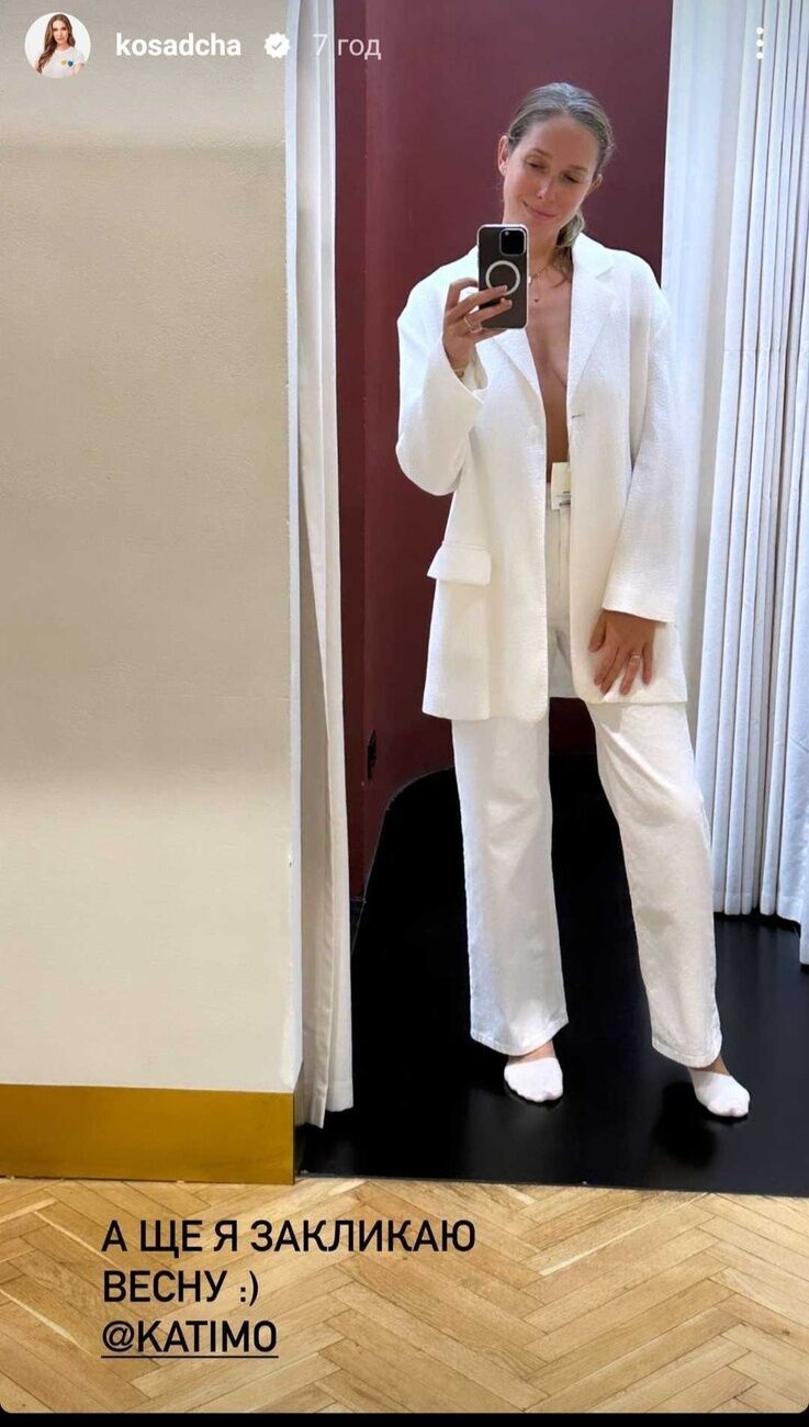 Украинская ведущая Катя Осадчая 29 марта разместила в Instagram Stories селфи, на котором запечатлена топлес в примерочной в белом брючном костюме от украинского бренда Katimo.