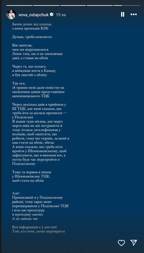 "Из-за того, что когда-то я выезжал жить в Канаду, я снимался с учета. Так вот, 18 мая мне дали повестку на обновление данных представители Шевченковского ТЦК. Спустя несколько дней я пришел в Шевченковский ТЦК, но мне сказали, что нужно идти по месту прописки – в Подольский [ТЦК]", – написал ведущий.