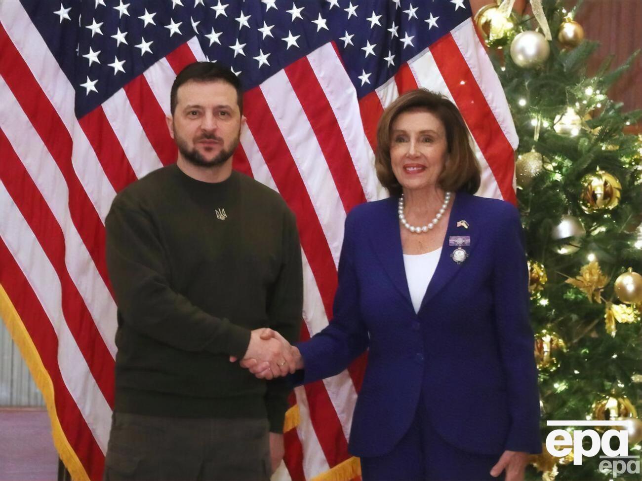 Президент Украины Владимир Зеленский в конце выступления в Конгрессе США в ночь на 22 декабря по Киеву вручил боевой флаг Украины спикеру Палаты представителей США Нэнси Пелоси. Во время вручения флага они поцеловали друг друга в щеки.