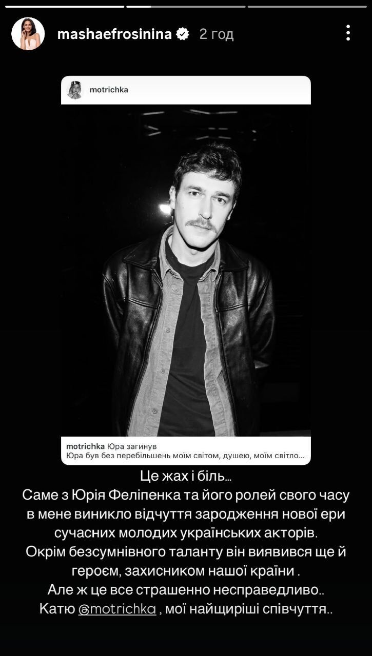 В Instagram Stories ведущая Маша Ефросинина отметила, что именно с ролей Фелипенко она почувствовала зарождение нового поколения украинских актеров.