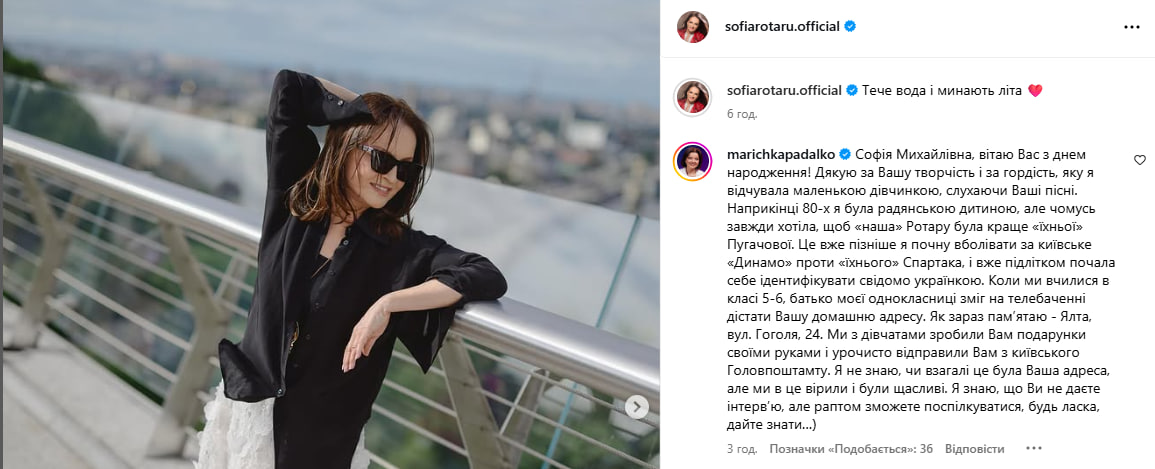 "София Михайловна, поздравляю вас с днем рождения! Спасибо за ваше творчество и за гордость, которую я испытывала маленькой девочкой, слушая ваши песни. В конце 80-х я была советским ребенком, но почему-то всегда хотела, чтобы "наша" Ротару была лучше "их" Пугачевой, – написала Падалко. – Когда мы учились в классе пятом-шестом, отец моей одноклассницы смог на телевидении получить ваш домашний адрес. Как сейчас помню – Ялта, ул. Гоголя, 24".