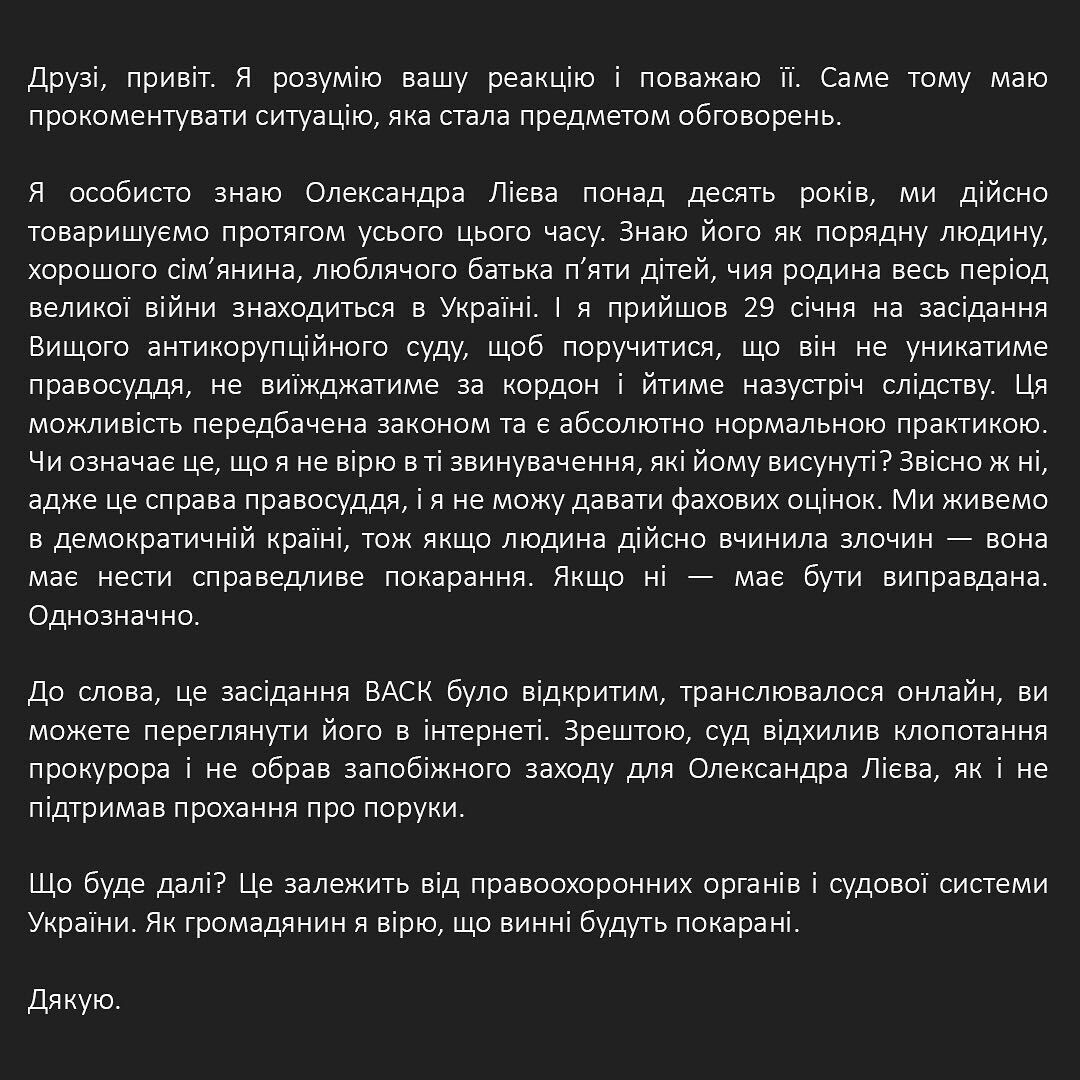 "Я пришел 29 января на заседание Высшего антикоррупционного суда, чтобы поручиться, что он не будет избегать правосудия, не будет выезжать за границу и будет идти навстречу следствию. Эта возможность предусмотрена законом и является абсолютно нормальной практикой. Означает ли это, что я не верю в те обвинения, которые ему выдвинуты? Конечно, нет, потому что это дело правосудия, и я не могу давать экспертных оценок", – отметил ведущий.