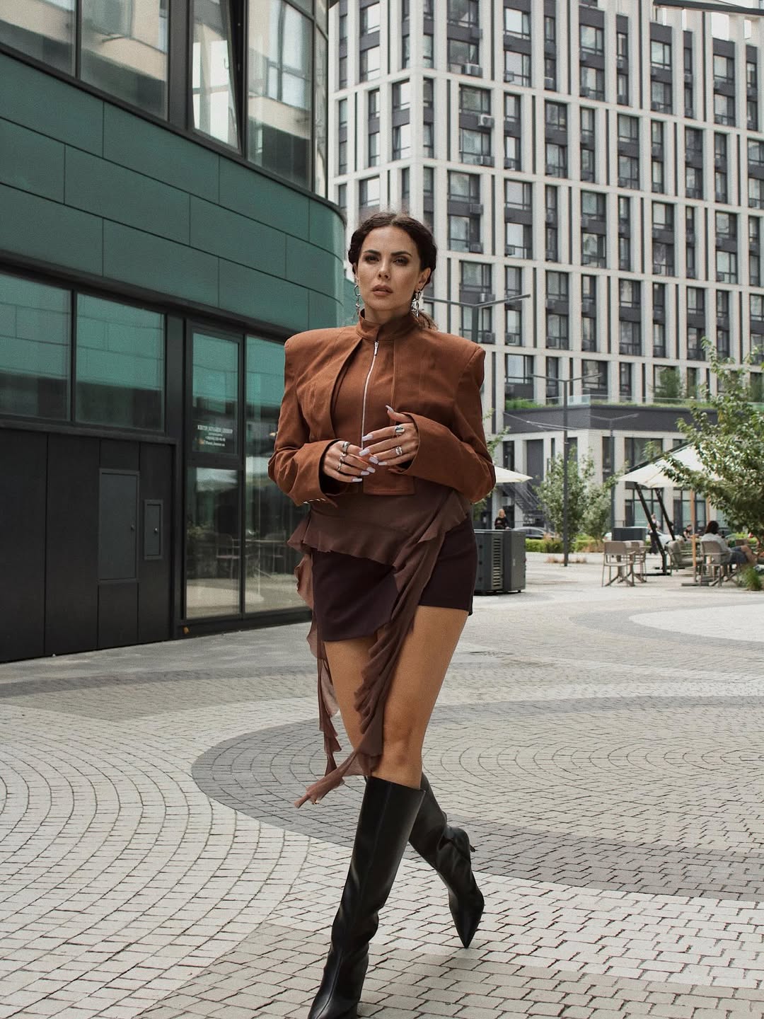 Певица снялась в коротком жакете и мини-юбке в коричневой гамме. Образ она дополнила высокими черными сапогами на каблуке.