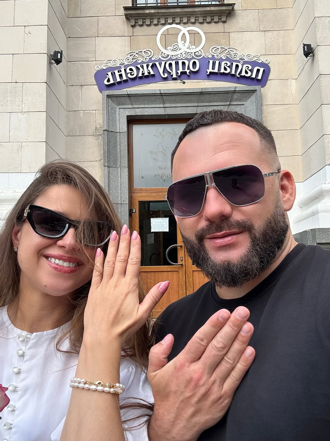 Певица обнародовала фото со своим избранником, на котором они показывают свои руки без колец на фоне центра бракосочетаний.