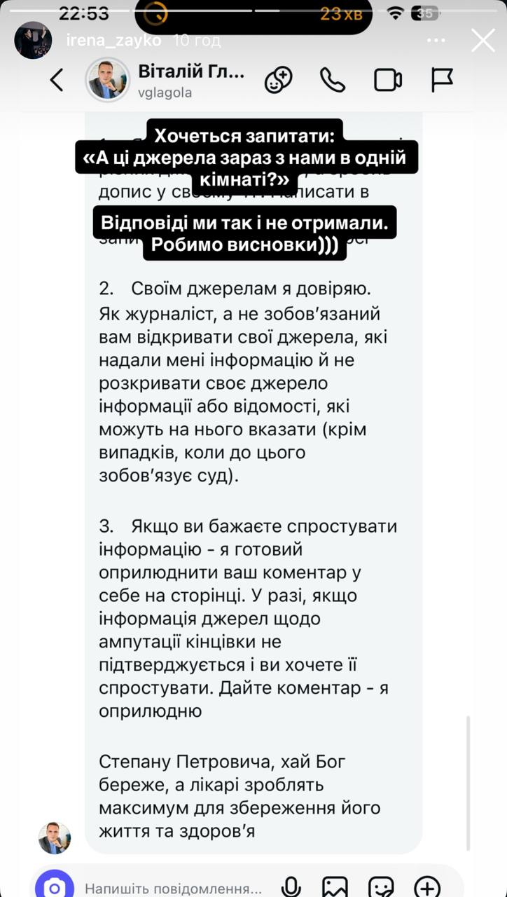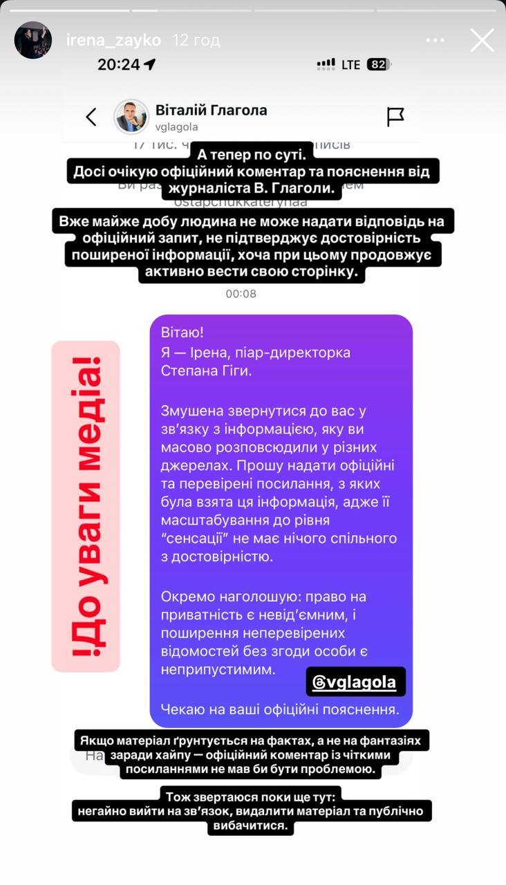 Пиарщица украинского артиста Степана Гиги Ирена Зайко 9 декабря разместила в Instagram Stories скриншоты переписки с украинским журналистом Виталием Глаголой – она требует, чтобы он назвал свои источники информации, которые сообщили ему, что певец после ампутации ноги находится в коме.