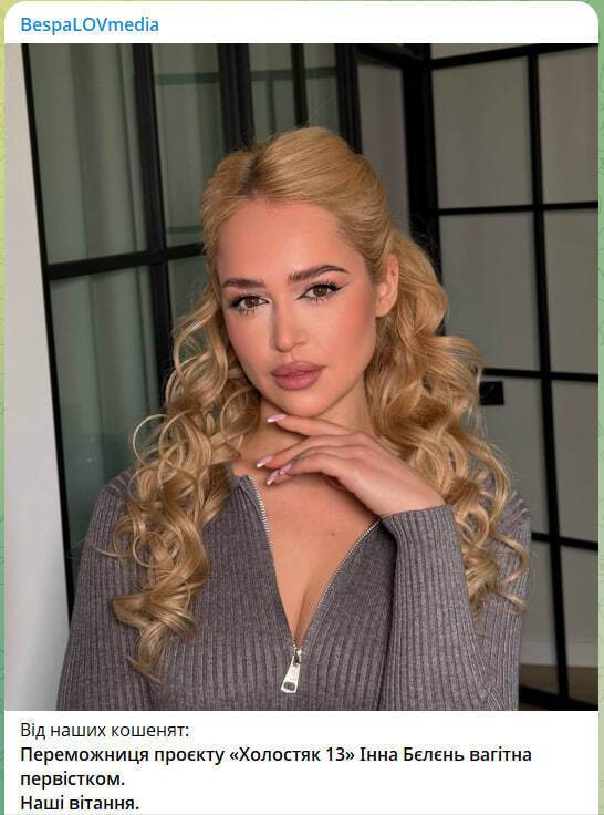 Победительница 13-го сезона шоу "Холостяк" на СТБ, украинский блогер Инна Белень беременна первенцем. Об этом 22 ноября в Telegram рассказал украинский блогер Богдан Беспалов, ссылаясь на информацию, полученную от своих осведомителей, фамилии которых называть не стал.