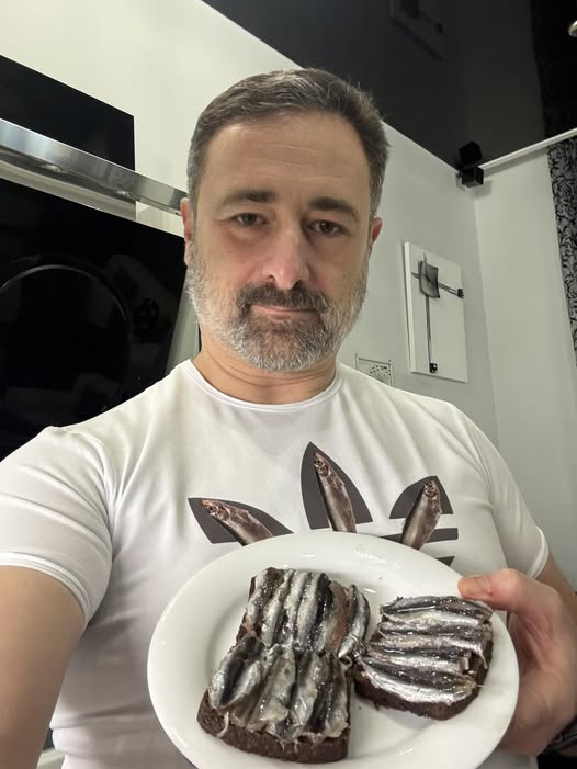 Смелянский позирует в кадре с тарелкой в руках, на которой лежат три бутерброда с тюлькой. Для съемки он выбрал белую тематическую футболку с изображением тюльки.