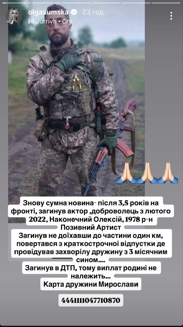 Детали трагедии рассказала в Instagram Stories коллега Наконечного, украинская актриса Ольга Сумская.