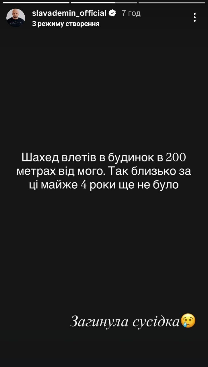 Украинский ведущий Слава Демин 23 декабря в Instagram Stories рассказал, что в Киевской области в результате ночного российского обстрела погибла его соседка.