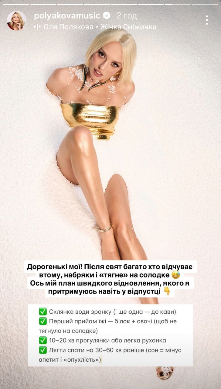 Украинская певица Оля Полякова 4 января в Instagram Stories поделилась своим планом быстрого восстановления после праздников, которого она придерживается даже в отпуске.