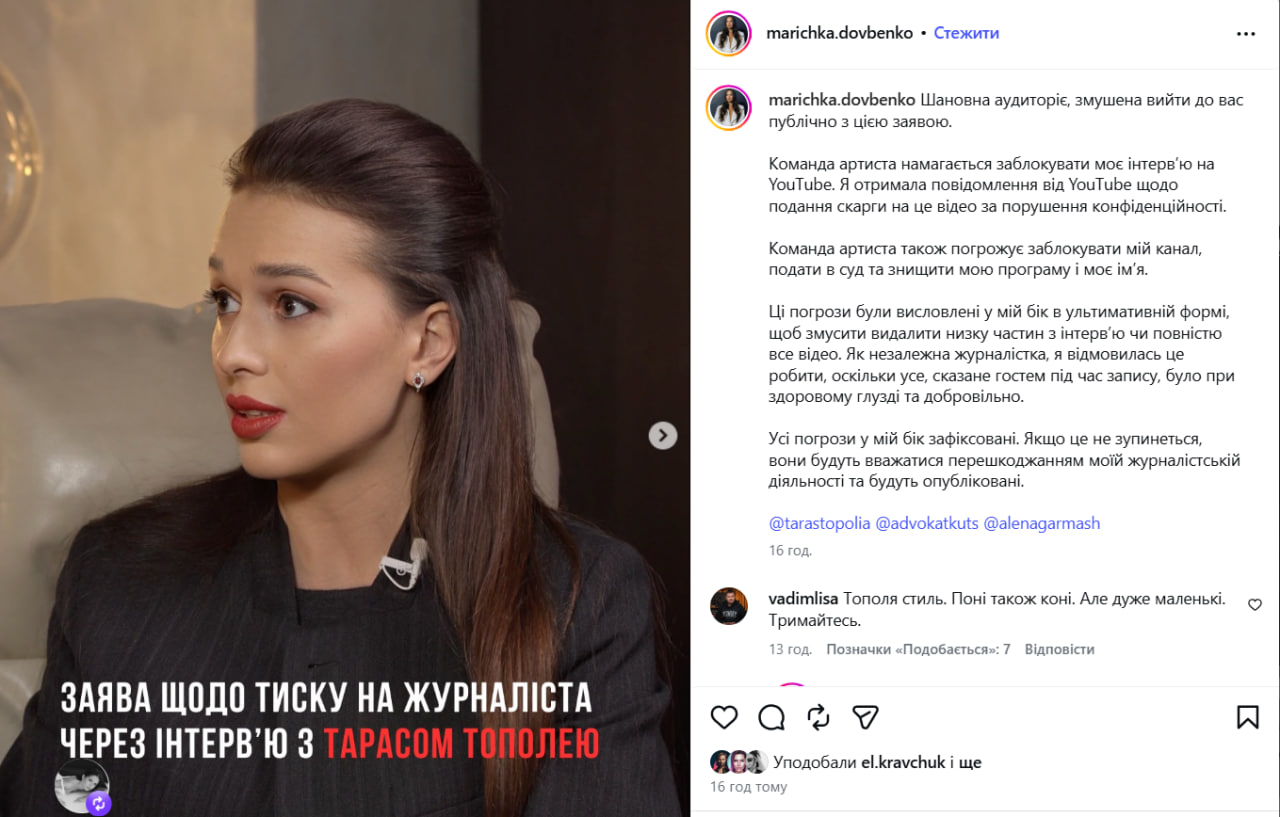 Украинский блогер Маричка Довбенко 7 апреля в Instagram обвинила в шантаже команду украинского артиста Тараса Тополи, заявив, что они требуют отредактировать ранее опубликованное с ним интервью в YouTube.