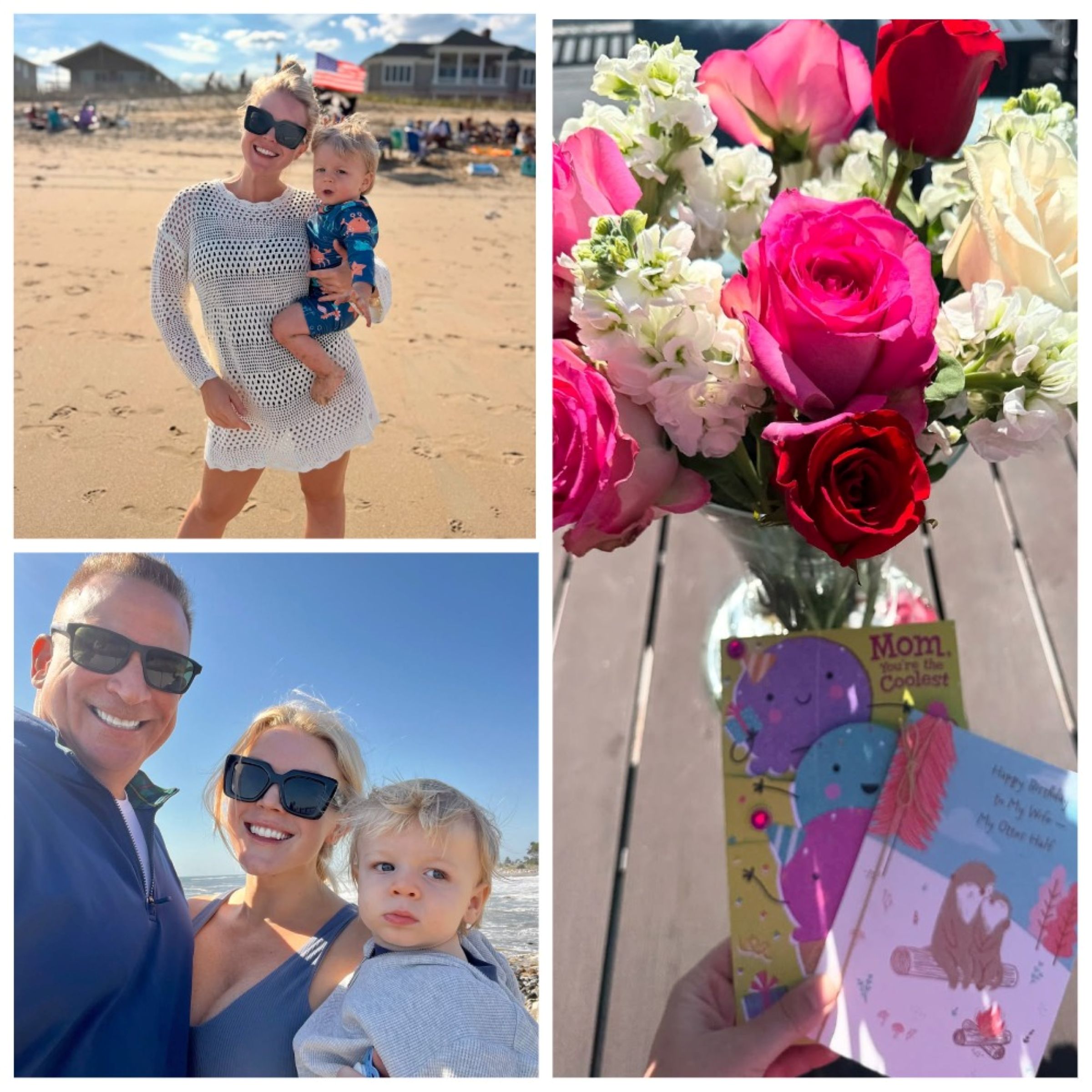 На снимках она запечатлена на пляже в компании своего мужа и их годовалого сына. Ливитт также показала цветы и открытки, которые от них получила.