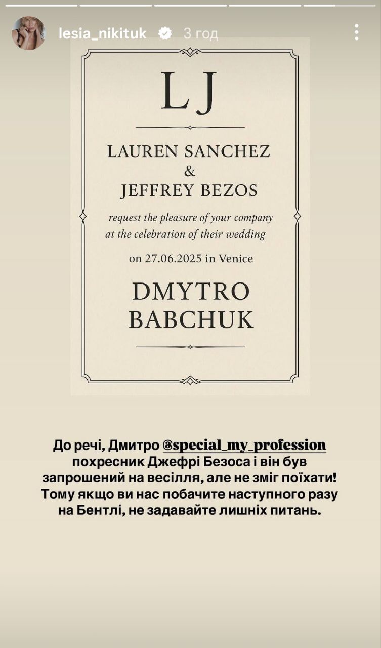 Украинская ведущая Леся Никитюк 28 июня в Instagram Stories пошутила, что ее муж, украинский военнослужащий Дмитрий Бабчук был приглашен на свадьбу американского миллиардера Джеффа Безоса и американской журналистки Лорен Санчес.
