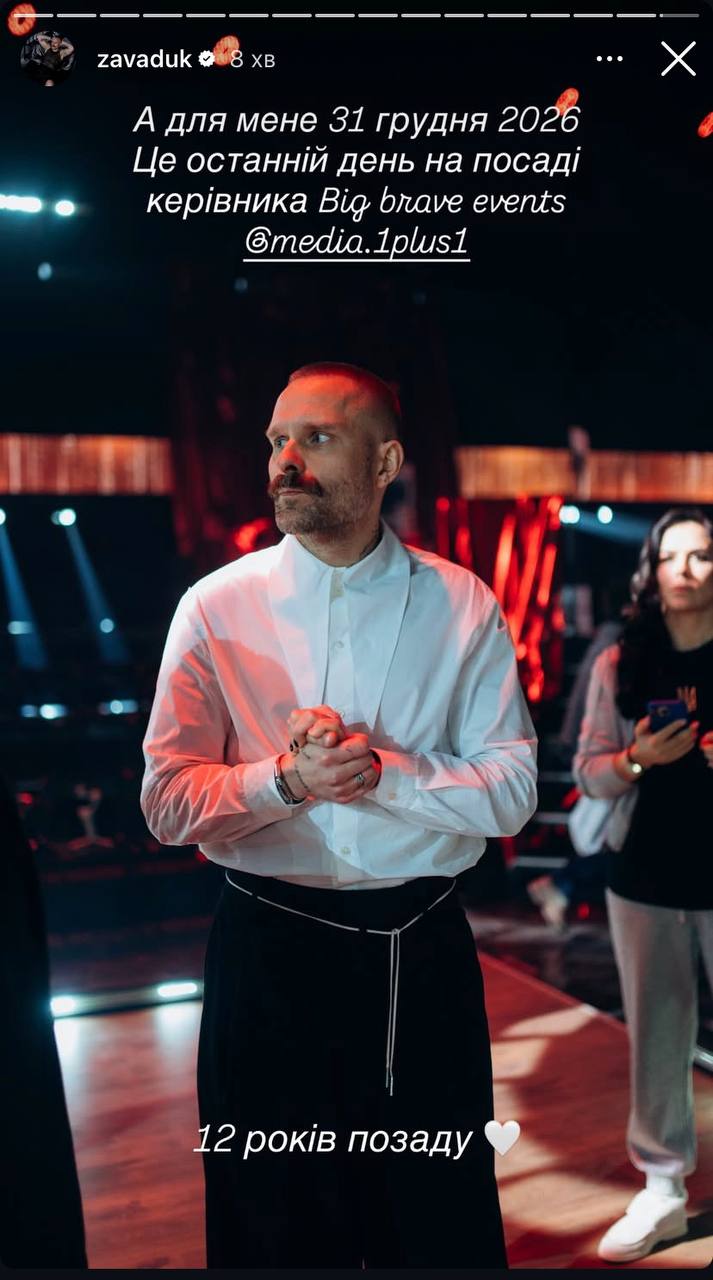 Продюсер украинской компании Big Brave Events, которая в том числе занималась съемками шоу "Танцы со звездами" на "1+1 Україна", Владимир Завадюк покинул свой пост. Об этом он сообщил 31 декабря в Instagram Stories.