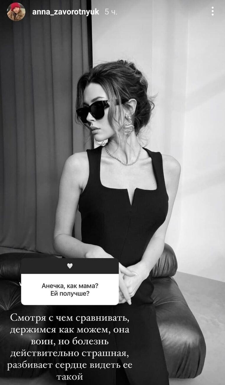 26-летняя российская Instagram-блогер Анна Заворотнюк 17 января, отвечая на вопросы подписчиков в Instagram Stories, рассказала о самочувствии своей матери, российской актрисы Анастасии Заворотнюк, которая с 2019 года борется с онкозаболеванием.