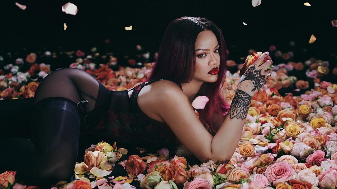 Рианна позировала в нижнем белье своего именного бренда. Она снялась лежа на полу, усеянном множеством роз.